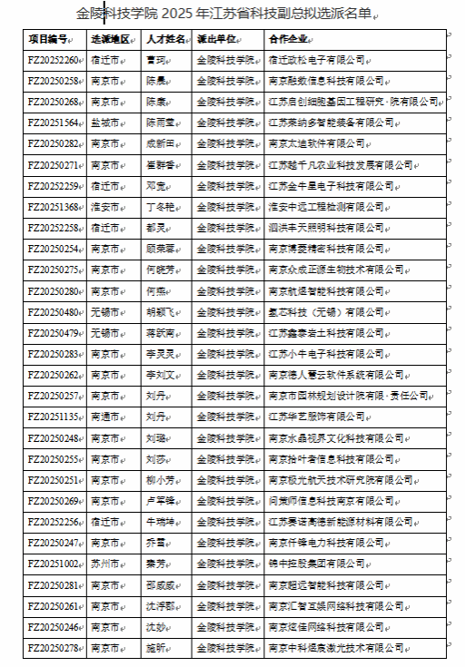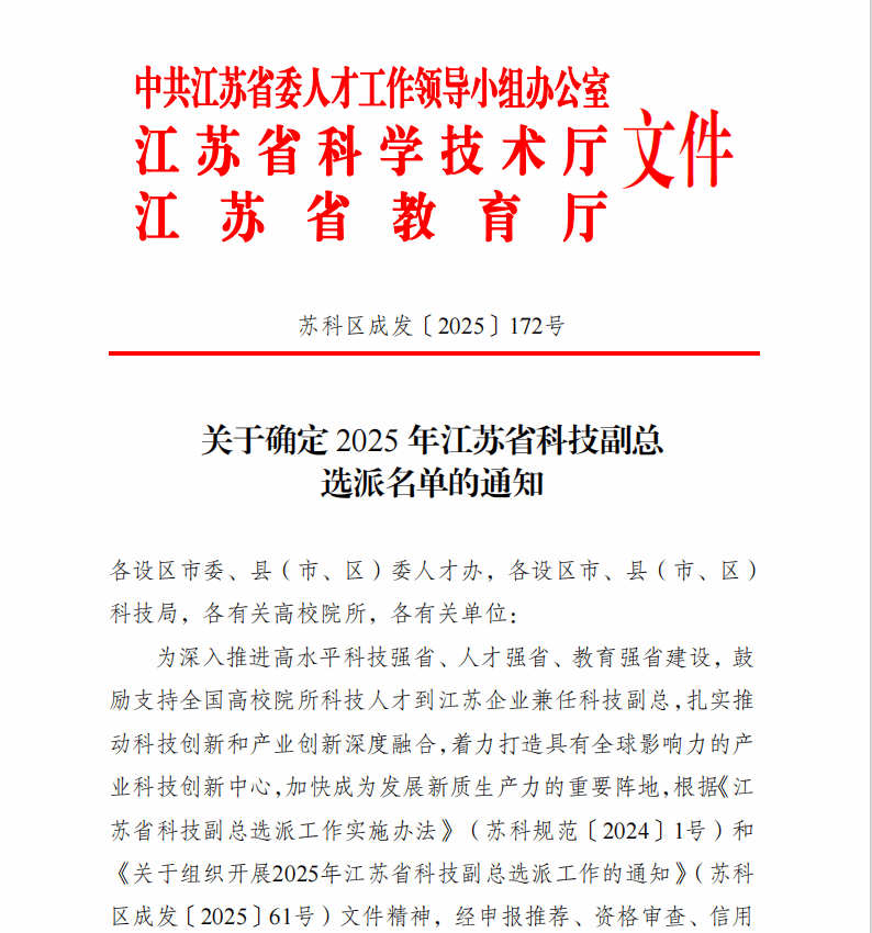日前,由省委人才办、省科技厅、省教育厅联合开展的江苏省科技副总选派工作,经过一系列严格有序的组织申报、材料汇总、项目遴选与专家评审等环节,通过江苏省科技厅对2025年江苏省科技副总拟选派对象进行了公示,全省共计拟选派2333名江苏省科技副总,我校有57人入选。