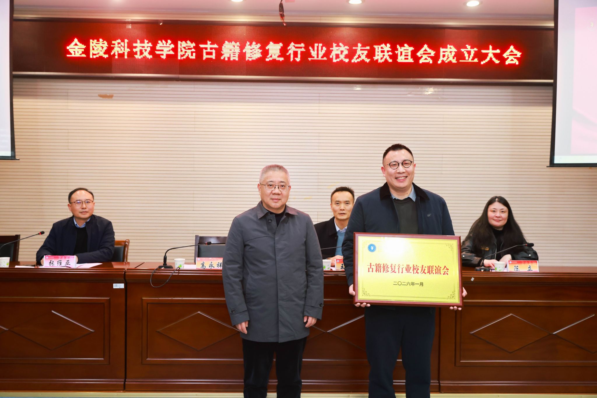 高永祥为联谊会授牌、授旗并讲话。他表示,我校古籍修复专业作为全国第一个古籍修复本科专业,自2004年开设以来,依托省文旅厅重点实验室、南京非遗研究基地、南京学研究基地等省市级平台,以建设首批国家古籍保护人才培训基地为契机,培养了一批有情怀、重交叉、强能力的古籍保护创新人才。广大校友在不同岗位上诠释着金科人的深厚文化担当,合力铸就了日益彰显影响力的“金科修复”品牌。他指出,古籍修复是一项功在当代、利在千秋的事业,需心怀敬畏、传承匠心,与时俱进、开拓创新。作为学校首个专业领域的行业校友组织,希望广大校友以此为平台,加强联络、深化合作,将分散的个体力量汇聚成“抱团发展”的行业合力,使联谊会成为凝聚情感、共享共赢的精神家园。他期待广大校友和各界人士持续关心支持学校发展,助力专业建设与人才培养,共同开展技艺推广、文化科普、志愿服务等活动,携手守护中华文脉,推动文化传承创新,为增强文化自信、建设文化强国贡献金科力量。