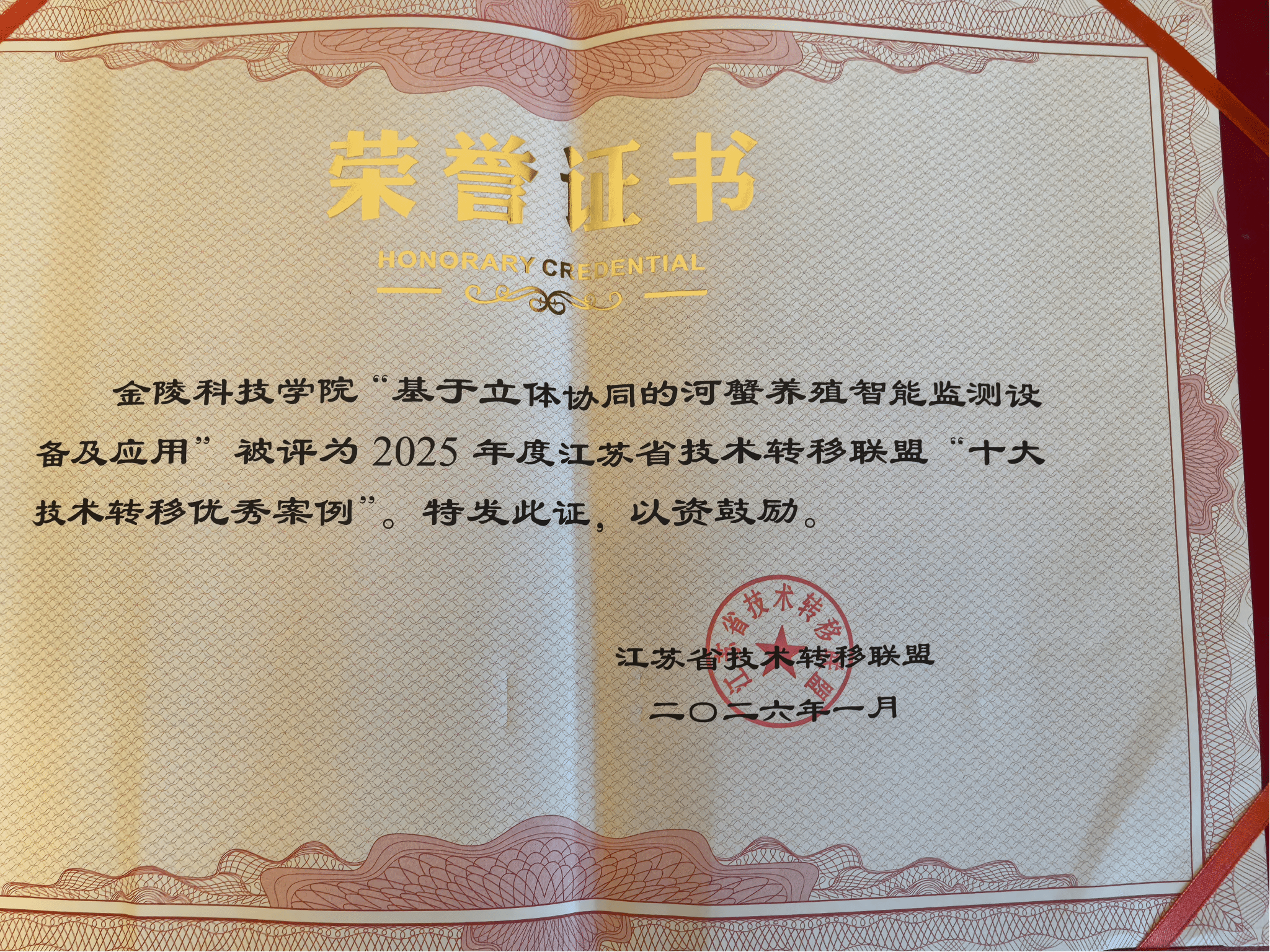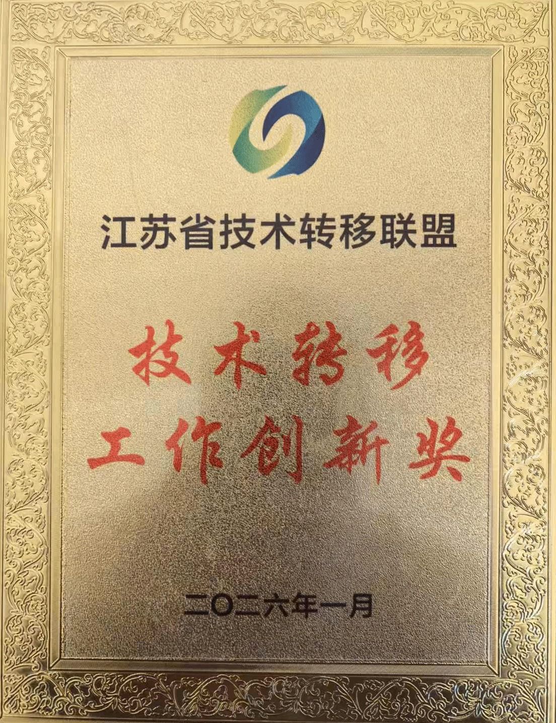 1月30日,2025年江苏省技术转移联盟年会在南京召开,会议对在技术转移工作中表现突出的集体和个人进行表彰。我校继2024年后再次荣获省内技术转移领域最高奖项——“技术转移工作创新奖”,与南京理工大学、江苏省新质生产力促进中心、南京师范大学等10家单位共同上榜。同时,我校“基于立体协同的河蟹养殖智能监测设备及应用”成功入选2025年度江苏省技术转移联盟“十大技术转移优秀案例”,这是学校首次斩获该类别省级优秀案例奖项,实现了综合荣誉与单项案例奖项的双重突破。