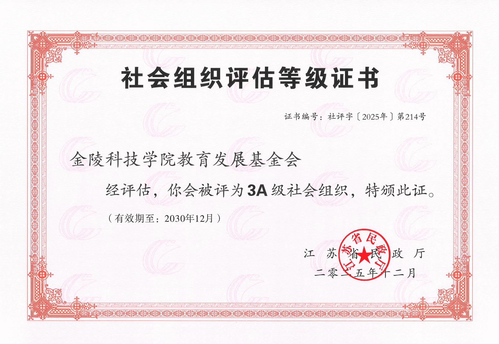 近日,江苏省民政厅正式公布了2025年度全省性社会组织评估等级结果,我校教育发展基金会获评为“3A级社会组织”。这是对基金会规范运作、公开透明和有效服务学校与社会的高度认可。